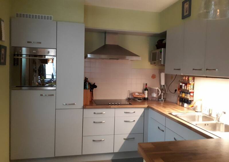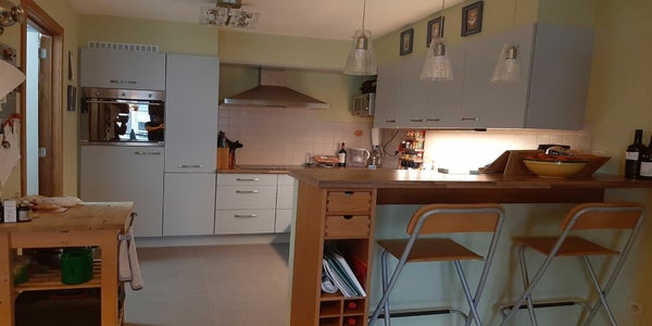 Open keuken op tegelvloer, volledig ingericht met ingebouwde oven, vaatwasser en koelkast. Keramische kookplaat met dampkap, voldoende werkblad en kasten met méér dan voldoende bergruimte. Dubbele spoelbak.