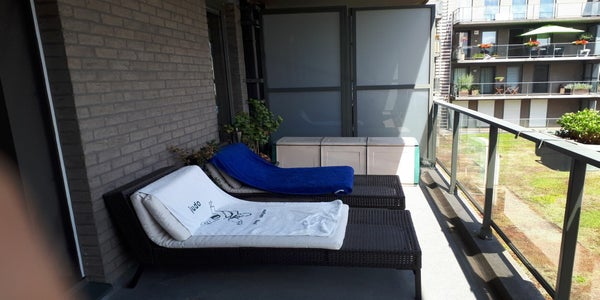 Ruim, rustig en gezellig terras aan de achterzijde en over de ganse breedte van het appartement. Uw extra kamer tijdens dagen met aangename buitentemperatuur.